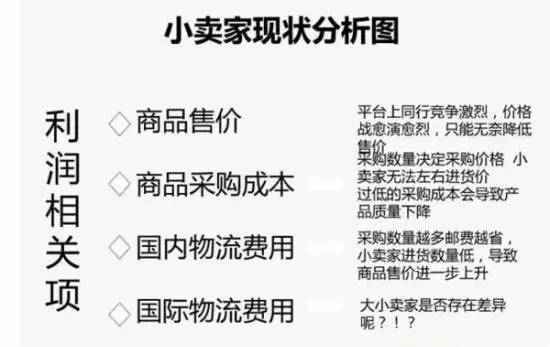 此次分享主要針對(duì)中小賣家的物流成本控制的問題,物流是從賣家到買家過程中重要的一個(gè)環(huán)節(jié),而大家常常忽視物流價(jià)格,直接影響的就是利潤(rùn)。那么我們來看看小賣家利潤(rùn)相關(guān)的現(xiàn)狀分析: