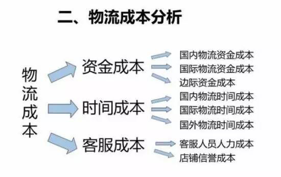 說完跨境物流流程,我們?cè)賮矸治鲆幌挛锪鞒杀尽N锪鞒杀局饕少Y金成本、時(shí)間成本、客服成本構(gòu)成,具體組成如下圖所示: