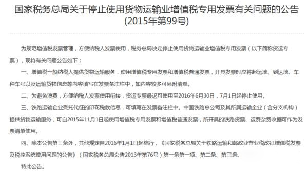國家稅務(wù)總局表示,由于增值稅發(fā)票系統(tǒng)升級版已全面推行,增值稅一般納稅人提供貨物運(yùn)輸服務(wù),統(tǒng)一使用增值稅專用發(fā)票可以滿足貨物運(yùn)輸業(yè)納稅人發(fā)票使用的需要,同時(shí)也符合增值稅規(guī)范管理的要求。為規(guī)范增值稅發(fā)票管理,減并發(fā)票種類,方便納稅人發(fā)票使用,因此要停止使用貨物運(yùn)輸業(yè)增值稅專用發(fā)票。