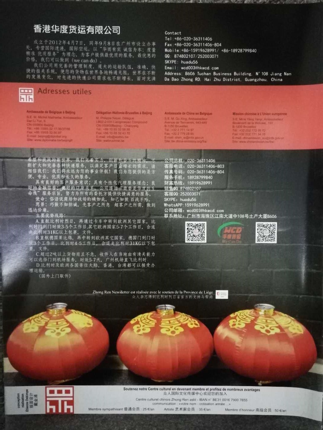 此次燈籠由北京虛苑文化藝術(shù)有限公司提供,由香港華度貨運(yùn)有限公司承運(yùn),接近1噸的貨物,從北京運(yùn)到廣州,再?gòu)膹V州出發(fā)至比利時(shí),緣于中外文化交流使者曲良臣對(duì)華度的認(rèn)可,并將華度設(shè)立為眾人國(guó)際文化傳媒中心廣州辦事處,將華度的簡(jiǎn)介印在雜志上,感謝比利時(shí)國(guó)際藝術(shù)雙年展中國(guó)主題年,感謝眾人國(guó)際文化傳媒中心,感謝北京虛苑文化藝術(shù)有限公司提供給華度服務(wù)的機(jī)會(huì)。