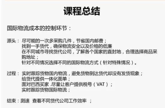 物流成本的控制是賣家應(yīng)該重點(diǎn)關(guān)注的一個(gè)環(huán)節(jié),所以認(rèn)真選擇物流的方式會(huì)讓小賣家更加有機(jī)會(huì)突破到大賣家。希望每個(gè)賣家都能成為大賣家,最后是本次分享的總結(jié),希望對(duì)大家有所幫助。