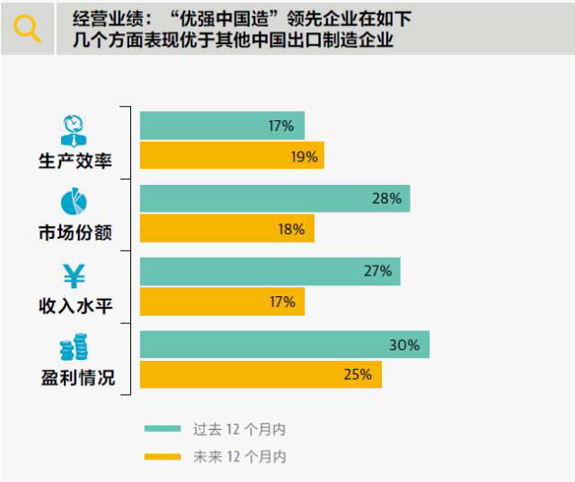 就生產效率、市場份額、收入水平和盈利情況這四項指標而言,“優(yōu)強中國造”領先企業(yè)在調研進行時表示過去 12 個月有所改善的可能性也更大。
