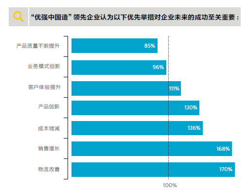 一個企業(yè)對“優(yōu)強中國造”優(yōu)先舉措的投入,與其經營業(yè)績之間有著顯著的關聯(lián)。與較不重視優(yōu)先舉措的企業(yè)相比,“優(yōu)強中國造”領先企業(yè)往往在生產效率、市場份額、收入水平和盈利情況方面都有更好表現(xiàn)。