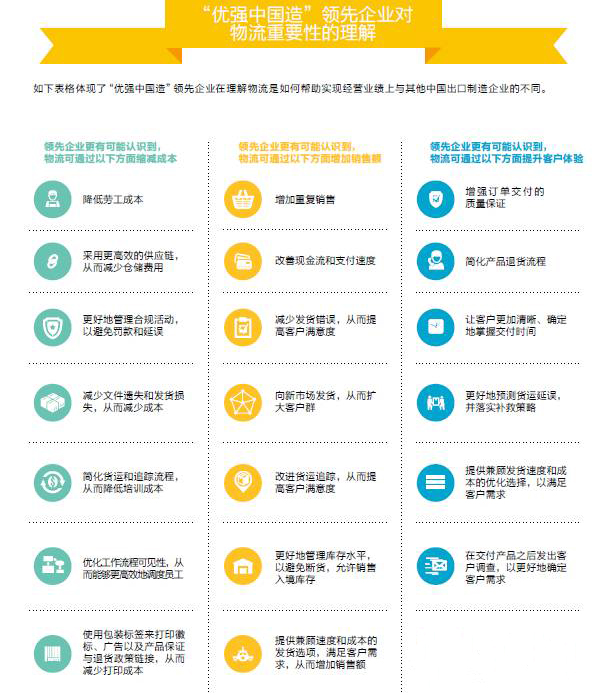 發(fā)展供應鏈是領先企業(yè)與其他企業(yè)的又一個決定性差異。“優(yōu)強中國造”領先企業(yè)能以更為廣闊的視角看待物流在驅動競爭優(yōu)勢方面的重要性,了解這一環(huán)節(jié)在增加銷售額、降低成本和提升客戶體驗等關鍵領域的重要作用。