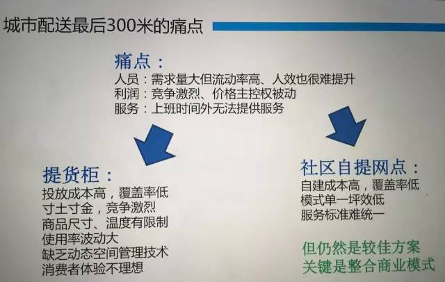 城配最后300米的痛點,人員需求量很大,很多快遞員,但是流動率很高,人效也很難提升,在既有的交通環(huán)境還有城管的控制底下,效率很難提升,有一個天花板那里。利潤也是一樣的,因為競爭激烈,而且價格主動權不在你手上,你沒有太多的話語權。服務,上班時間之外很難提供服務,要不然你給加班費,就算你給加班費,消費者不一定接受,有一系列因素的影響,這是我看到的一些痛點。