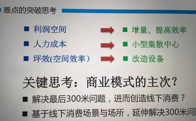 關鍵的思考還是在這里,這個才是我今天的重點,商業(yè)模式的主次?你們的商業(yè)模式跟我的商業(yè)模式是不同的,但是我們都會為最后300米這個事情做一些思考跟貢獻。我們是解決最后300米問題,進而去創(chuàng)造線下的消費嗎?大家都知道最后300米這件事情就是利潤不高嘛,我做城配可以同時延伸一些其他業(yè)務出來,沒有錯,我沒說這個是錯的,只不過是方向角度的問題。我跟你們的方向角度不一樣,所以我們是基于線下消費場所跟場景,延伸解決300米問題,這才是我們的能力所及。你們都是我的前輩,你們的實力都遠遠在我們之上,但是做商業(yè)網點就是我們的強項了,所以我們是這樣子去解決。