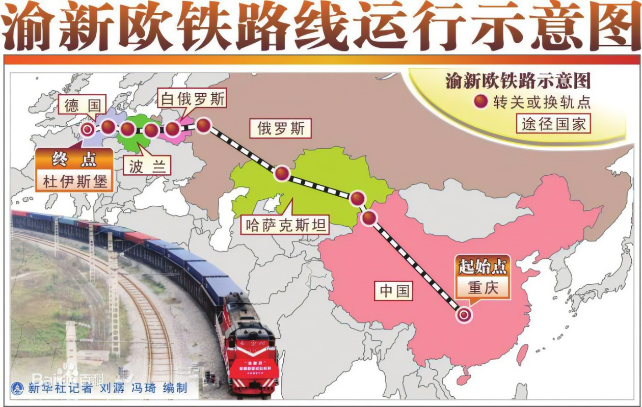 中歐班列從重慶出發(fā),開往波蘭馬拉舍維奇,裝載著 挪威、瑞士、丹麥、荷蘭、奧地利、瑞典、芬蘭、意大利、匈牙利、捷克、法國、英國、德國等歐洲國家的郵件,從新疆阿拉山口口岸出境,經(jīng)哈薩克斯坦、俄羅斯、白俄羅斯,抵達波蘭馬拉舍維奇,再由波蘭郵政卡車中轉至歐洲各國郵政。